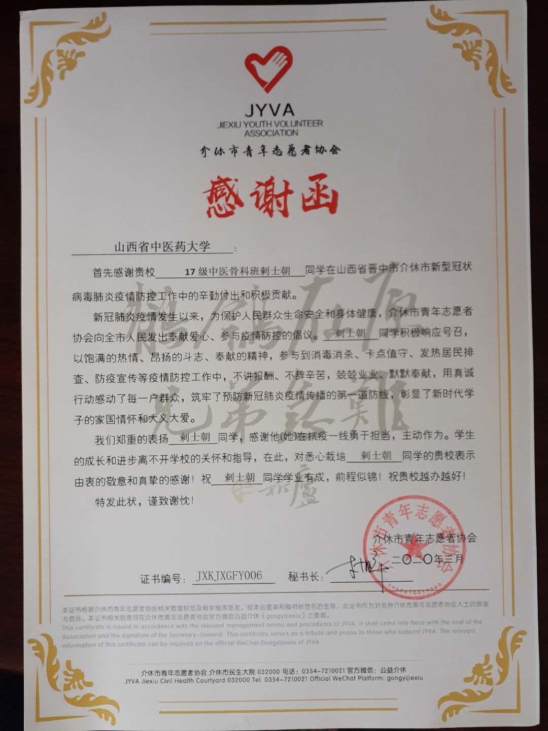 新冠肺炎疫情发生以来,作为一名医学院校学生,剌士朝同学积极响应党的号召,参加了介休市青年志愿者协会组织的疫情防控工作,在疫情防护宣传、消毒消杀、卡点值守、发放居民排查等志愿服务工作中做出了积极贡献,用实际行动诠释了当代青年的责任与使命。剌士朝同学以饱满的工作热情,默默奉献的精神,用真诚的行动筑牢预防新冠肺炎疫情传播的第一道防线,彰显了新时代学子的优良素质,践行医学生的责任与担当,树立了山西中医药大学的良好形象。