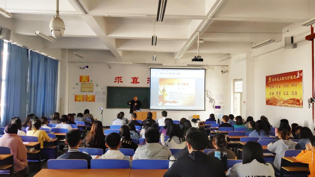吉广庆对“四史”——“党史、新中国史、改革开放史、社会主义发展史”进行了简要概述,带领大家共同回望了中国共产党自成立以来,团结带领全国各族人民完成并推进了三件大事,探索出了一条具有中国特色的社会主义道路,并朝着实现中华民族伟大复兴的中国梦而不懈奋斗。