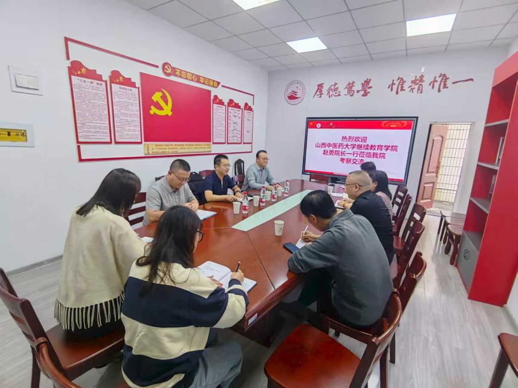 考察调研中,赵勇院长对蒋俊书记的热情接待表示感谢,介绍了山西中医药大学继续教育学院学历教育、非学历社会培训方面的发展历程、专业设置、教学管理、办学特色等方面的情况,重点了解了湖南中医药大学继续教育学院在信息化建设、规范化考试及教学平台建设等方面开展情况。